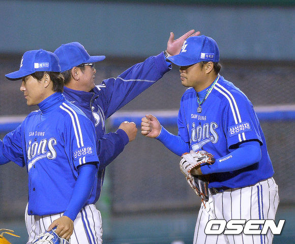 경기 종료후 류중일 감독이 결승타점의 주인공 박한이와 승리의 기쁨을 나누고 있다./ ajyoung@osen.co.kr