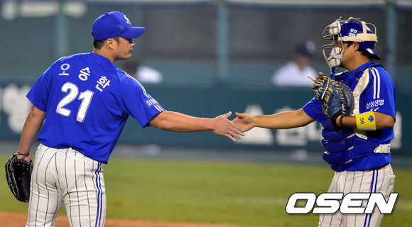 승리를 거둔 삼성 오승환과 이지영이 악수를 나누고 있다./rumi@osen.co.kr