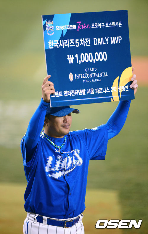 경기 종료 직후 8회초 결승 2타점 적시타를 날린 삼성 박한이가 5차전 MVP에 선정된 후 피켓을 들고 포즈를 취하고 있다. /jpnews@osen.co.kr