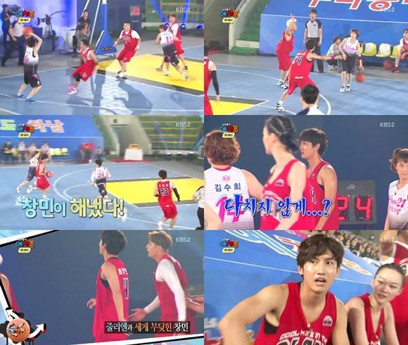 이에 이혜정은 “다치지 않게 손만 들고 점프하라”고 조언했지만, 이후 창민은 리바운드를 하다 줄리엔강과 부딪쳐 발목 부상을 당했다. 창민은 인상을 쓰면서도 괜찮다는 사인을 보내며 자신의 부상을 걱정하는 멤버들을 안심시켰다.