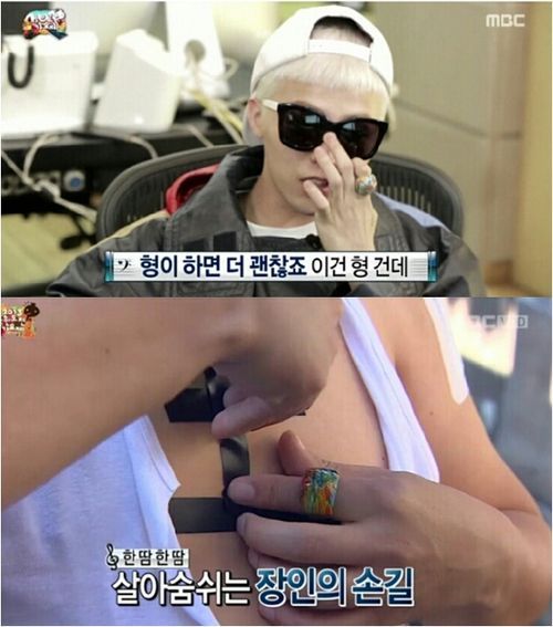 지난 27일 한 인터넷 커뮤니티에는 지드래곤과 정형돈이 커플링을 끼고 있는 MBC 예능프로그램 ‘무한도전’ 방송 화면이 올라왔다. 화면 속 두 사람은 화려한 색깔의 커플링을 나란히 끼고 있다.