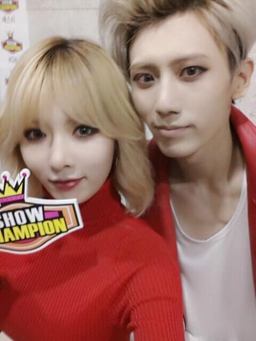 공개된 사진에는 빨간색 커플룩을 입고 다정한 포즈를 취하고 있는 현아와 장현승의 모습이 담겨 있다. 현아와 장현승은 짙은 무대 화장을 해 섹시한 매력을 더했다.