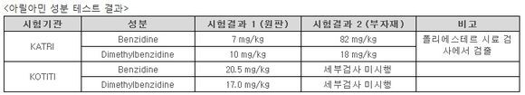 베이직하우스의 자체 생산 매뉴얼에 따르면 아릴아민 성분이 없는 염료를 틴 및 오일 과정에 사용하도록 돼 있으나 상반되는 테스트 결과가 나왔다.