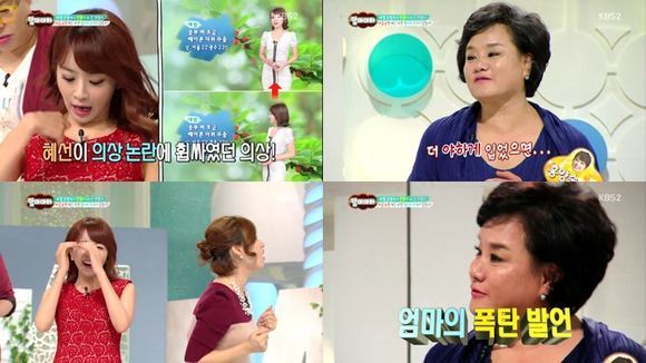 반면 김혜선 기상캐스터의 어머니는 “나는 딸이 더 야하게 입으면 좋겠다”고 말해 의아함을 자아냈다.