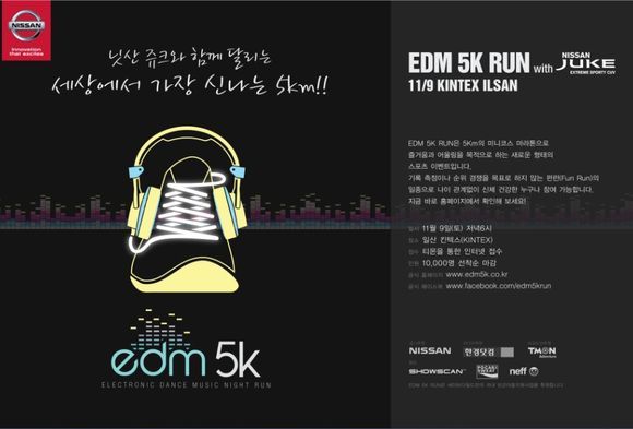 국내 최초 파티형 마라톤 'EDM 5K RUN(Electronic Dance Music Night Run)'은 기록 갱신이 아닌 '즐거움, 어울림, 건강'을 목표로 기획됐다. 5Km의 톡톡 튀는 테마 레이스에서 달리기와 일렉트로닉 댄스뮤직을 함께 즐기는 신개념 이벤트다. 닛산 관계자는 "유니크한 개성, Fun한 드라이빙 감각을 모두 겸비한 '쥬크'의 독특한 매력을 국내 소비자들에게 널리 알리고자 'EDM 5K RUN'행사를 후원하게 됐다"고 밝혔다.