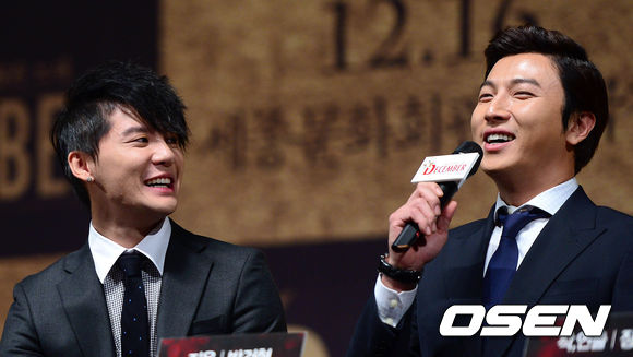 배우 김준수와 박건형이 기자간담회 중 환하게 웃고 있다.