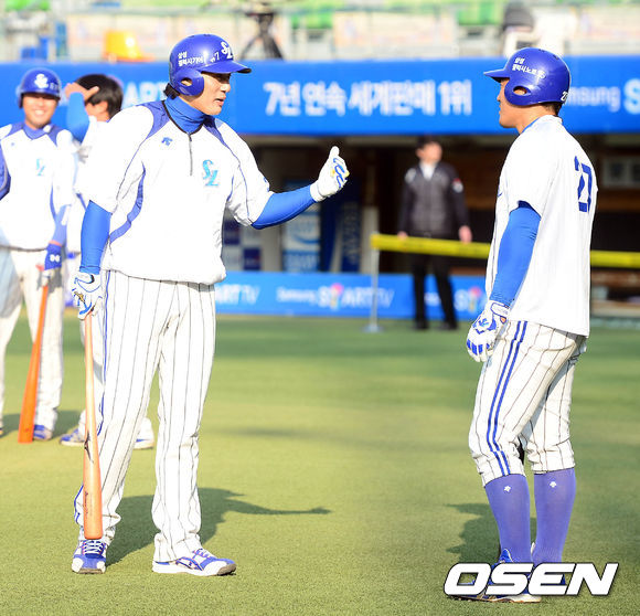 31일 오후 대구구장에서 열리는 '2013 한국야쿠르트 세븐 프로야구' 한국시리즈 6차전 삼성 라이온즈와 두산 베어스의 경기 시작전 이승엽이 이정식과 이야기를 나누고 있다.