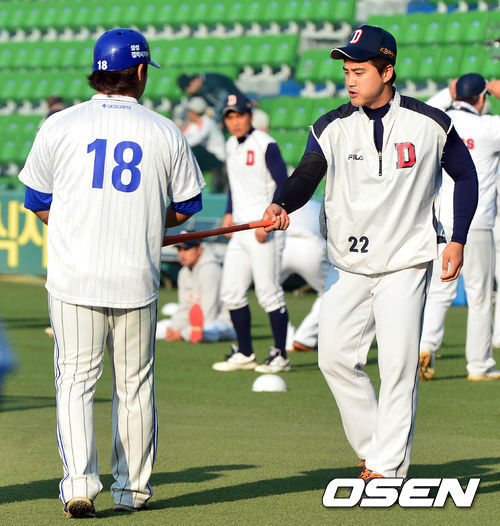 31일 오후 대구구장에서 열리는 '2013 한국야쿠르트 세븐 프로야구' 한국시리즈 6차전 삼성 라이온즈와 두산 베어스의 경기 시작전 홍성흔과 박석민이 장난을 치고 있다.