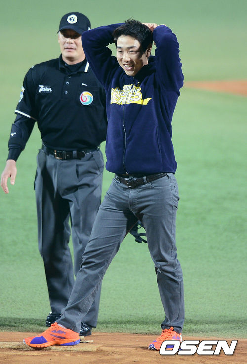 31일 오후 대구구장에서 열리는 '2013 한국야쿠르트 세븐 프로야구' 한국시리즈 6차전 삼성 라이온즈와 두산 베어스의 경기에 앞서 프로골퍼 배상문이 시구를 하고 있다.
