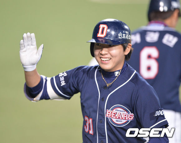 31일 오후 대구구장에서 열리는 '2013 한국야쿠르트 세븐 프로야구' 한국시리즈 6차전 삼성 라이온즈와 두산 베어스의 경기, 1회초 선두타자 정수빈 우월솔로 홈런을 날리고 덕아웃을 향하며 환하게 웃고 있다.