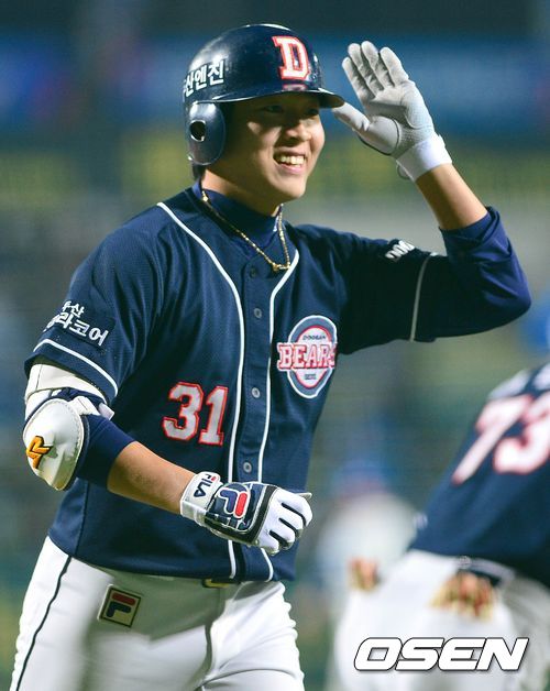 31일 오후 대구구장에서 열린 '2013 한국야쿠르트 세븐 프로야구' 한국시리즈 6차전 삼성 라이온즈와 두산 베어스의 경기, 1회초 두산 공격 선두타자로 나선 정수빈이 선제 우월 솔로포를 날리고 홈베이스를 밟으며 환하게 미소짓고 있다.
