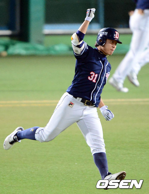 31일 오후 대구구장에서 열린 '2013 한국야쿠르트 세븐 프로야구' 한국시리즈 6차전 삼성 라이온즈와 두산 베어스의 경기 1회초 선두타자 정수빈이 솔로포를 치고 환호하고 있다.