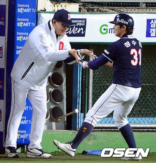 31일 오후 대구구장에서 열린 '2013 한국야쿠르트 세븐 프로야구' 한국시리즈 6차전 삼성 라이온즈와 두산 베어스의 경기 1회초 선두타자 정수빈이 솔로포를 치고 김진욱 감독과 하이파이브를 하고 있다.