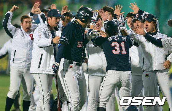 31일 오후 대구구장에서 열린 '2013 한국야쿠르트 세븐 프로야구' 한국시리즈 6차전 삼성 라이온즈와 두산 베어스의 경기, 1회초 두산 공격 선두타자로 나선 정수빈이 선제 우월 솔로포를 날리고 더그아웃 동료들과 인사를 나누고 있다.