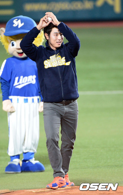 31일 오후 대구구장에서 열리는 '2013 한국야쿠르트 세븐 프로야구' 한국시리즈 6차전 삼성 라이온즈와 두산 베어스의 경기에 앞서 프로골퍼 배상문이 글러브 없이 시구를 하고 있다.