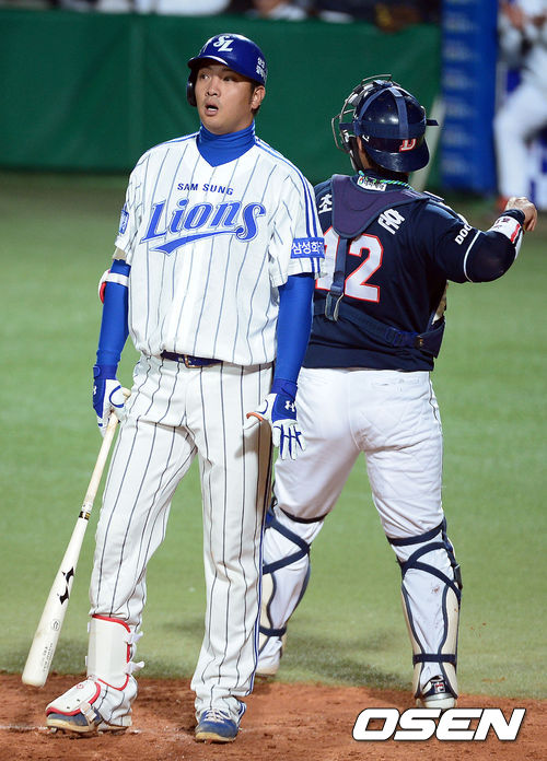31일 오후 대구구장에서 열리는 '2013 한국야쿠르트 세븐 프로야구' 한국시리즈 6차전 삼성 라이온즈와 두산 베어스의 경기, 1회말 2사 삼성 채태인이 두산 니퍼트에게 삼진을 당한 뒤 당황스러워하고 있다.