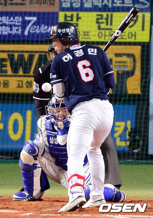 31일 오후 대구구장에서 열린 '2013 한국야쿠르트 세븐 프로야구' 한국시리즈 6차전 삼성 라이온즈와 두산 베어스의 경기 2회초 2사 1,2루 허경민이 배영수의 투구에 몸을 맞고 있다.