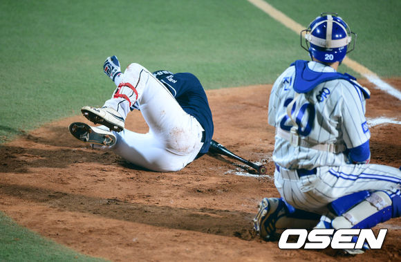 31일 오후 대구구장에서 열린 '2013 한국야쿠르트 세븐 프로야구' 한국시리즈 삼성 라이온즈와 두산 베어스의 6차전, 2회초 2사 1,2루에서 두산 허경민이 삼성 배영수의 투구에 맞고 괴로워하고 있다.