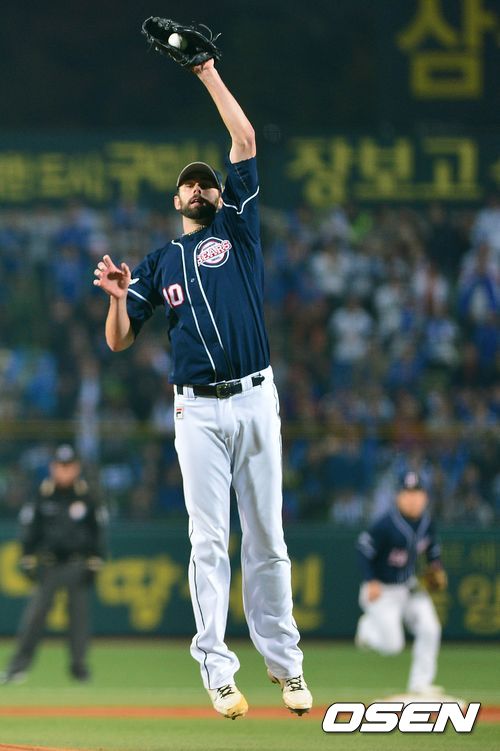 31일 오후 대구구장에서 열린 '2013 한국야쿠르트 세븐 프로야구' 한국시리즈 6차전 삼성 라이온즈와 두산 베어스의 경기, 2회말 삼성 공격 1사 주자없는 상황 이승엽의 투수 앞 땅볼 타구를 두산 선발 니퍼트가 펄쩍 뛰어 잡아내고 있다.