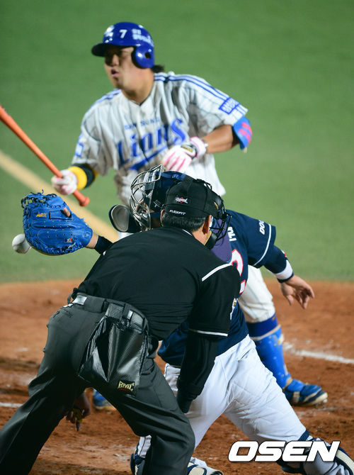 31일 오후 대구구장에서 열린 '2013 한국야쿠르트 세븐 프로야구' 한국시리즈 삼성 라이온즈와 두산 베어스의 6차전, 2회말 2사에서 두산 최재훈이 삼성 박석민의 타석에 볼을 미트에서 빠뜨리고 있다.