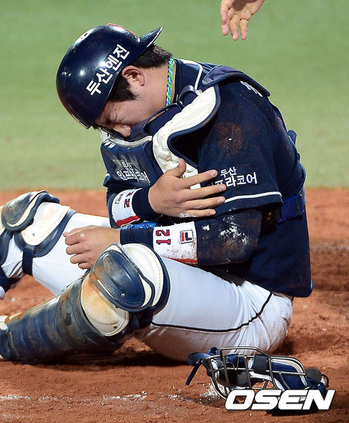 31일 오후 대구구장에서 열리는 '2013 한국야쿠르트 세븐 프로야구' 한국시리즈 6차전 삼성 라이온즈와 두산 베어스의 경기, 2회말 2사 삼성 박석민 타석때 두산 최재훈이 니퍼트의 공을 잡으려다 손목이 꺾여 고통스러워 하고 있다.