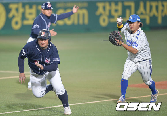 31일 오후 대구구장에서 열리는 '2013 한국야쿠르트 세븐 프로야구' 한국시리즈 6차전 삼성 라이온즈와 두산 베어스의 경기, 3회초 무사 2,3루 손시헌 3루앞 땅볼때 3루 주자 최준석 런다운에 걸려 아웃 처리되고 있다.