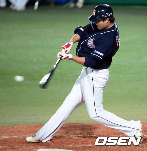 31일 오후 대구구장에서 열리는 '2013 한국야쿠르트 세븐 프로야구' 한국시리즈 6차전 삼성 라이온즈와 두산 베어스의 경기, 3회초 무사 1루 두산 오재일이 2루타를 때리고 있다.