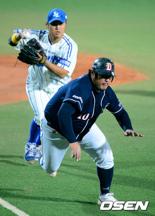 31일 오후 대구구장에서 열린 '2013 한국야쿠르트 세븐 프로야구' 한국시리즈 삼성 라이온즈와 두산 베어스의 6차전, 3회초 무사 2,3루에서 두산 손시헌의 3루땅볼에 협살에 걸린 최준석이 삼성 박석민의 태그를 피해 홈으로 쇄도하고 있다.