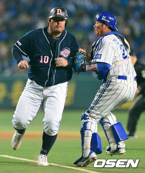 31일 오후 대구구장에서 열린 '2013 한국야쿠르트 세븐 프로야구' 한국시리즈 6차전 삼성 라이온즈와 두산 베어스의 경기, 3회초 두산 공격 무사 2, 3루 상황 손시헌의 내야 땅볼 때 삼성 포수 진갑용이 3루 주자 최준석을 상대로 런다운플레이를 펼쳐 태그아웃 시키고 있다.