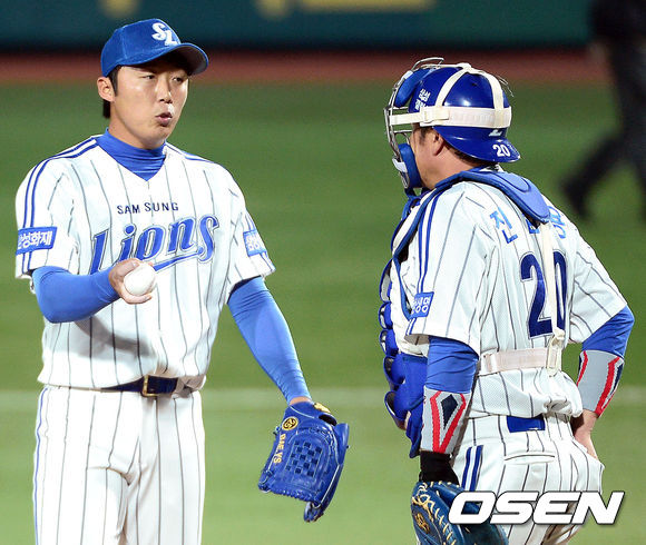 31일 오후 대구구장에서 열리는 '2013 한국야쿠르트 세븐 프로야구' 한국시리즈 6차전 삼성 라이온즈와 두산 베어스의 경기, 3회초 무사 2,3루 두산 손시헌 타석때 삼성 배영수와 진갑용이 이야기를 나누고 있다.