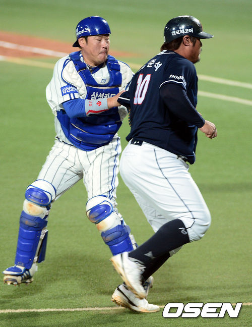 31일 오후 대구구장에서 열리는 '2013 한국야쿠르트 세븐 프로야구' 한국시리즈 6차전 삼성 라이온즈와 두산 베어스의 경기, 3회초 무사 2,3루 삼성 진갑용이 두산 손시헌의 3루 앞 땅볼때 홈으로 쇄도하던 최준석을 태그아웃으로 잡아내고 있다.