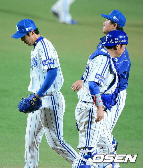 31일 오후 대구구장에서 열린 '2013 한국야쿠르트 세븐 프로야구' 한국시리즈 삼성 라이온즈와 두산 베어스의 6차전, 3회초 1사 2,3루에서 삼성 배영수가 강판당하고 있다.
