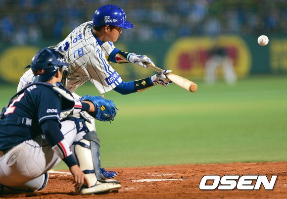31일 오후 대구구장에서 열린 '2013 한국야쿠르트 세븐 프로야구' 한국시리즈 6차전 삼성 라이온즈와 두산 베어스의 경기, 3회말 삼성 공격 무사 2루 상황 정병곤이 희생번트를 성공시키고 있다.