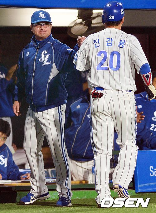 31일 오후 대구구장에서 열린 '2013 한국야쿠르트 세븐 프로야구' 한국시리즈 6차전 삼성 라이온즈와 두산 베어스의 경기, 3회말 삼성 공격 1사 3루 상황 배영섭의 동점 1타점 중견수 희생플라이 때 득점에 성공한 진갑용이 류중일 감독과 인사를 나누고 있다.