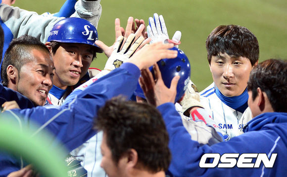 31일 오후 대구구장에서 열리는 '2013 한국야쿠르트 세븐 프로야구' 한국시리즈 6차전 삼성 라이온즈와 두산 베어스의 경기, 3회말 1사 3루 삼성 진갑용이 배영섭의 중견수 희생플라이때 득점을 올린 뒤 동료들에게 축하받고 있다.