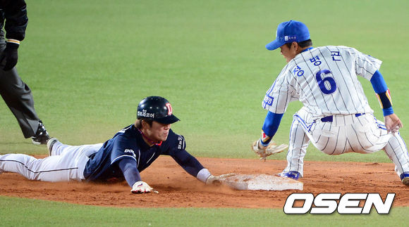 31일 오후 대구구장에서 열린 '2013 한국야쿠르트 세븐 프로야구' 한국시리즈 6차전 삼성 라이온즈와 두산 베어스의 경기 4회초 2사 1루 김현수 타석, 1루주자 허경민이 도루에 성공하고 있다.