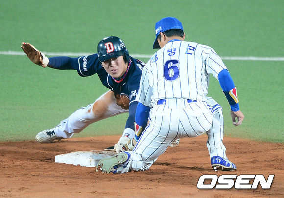 31일 오후 대구구장에서 열린 '2013 한국야쿠르트 세븐 프로야구' 한국시리즈 삼성 라이온즈와 두산 베어스의 6차전, 4회초 2사에서 두산 허경민이 김현수 타석에 삼성 정병곤의 태그에 앞서 2루 도루에 성공하고 있다.