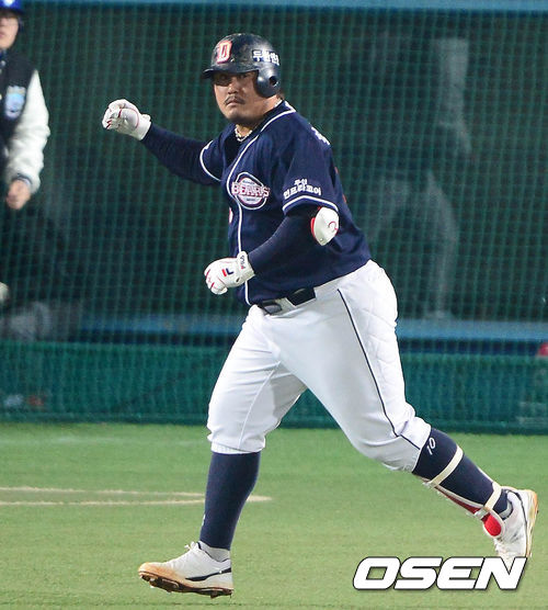 31일 오후 대구구장에서 열린 '2013 한국야쿠르트 세븐 프로야구' 한국시리즈 6차전 삼성 라이온즈와 두산 베어스의 경기 5회초 선두타자 최준석이 솔로홈런을 치고 기뻐하고 있다.