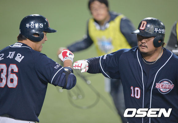 31일 오후 대구구장에서 열리는 '2013 한국야쿠르트 세븐 프로야구' 한국시리즈 6차전 삼성 라이온즈와 두산 베어스의 경기, 5회초 선두타자 최준석 솔로 홈런을 날리고 홈인 오재일의 환영을 받고 있다.