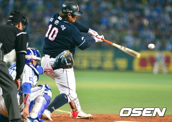 31일 오후 대구구장에서 열린 '2013 한국야쿠르트 세븐 프로야구' 한국시리즈 6차전 삼성 라이온즈와 두산 베어스의 경기, 5회초 두산 공격 선두타자로 나선 최준석이 좌중간 솔로포를 날리고 있다.