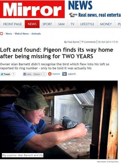 집 돌아온 비둘기의 주인은 영국 체셔 주 스톡포트에 거주하는 알란 바넷(65). 바넷은 2년 전 자신이 기르던 비둘기 릴리가 집까지 찾아왔다고 밝혔다.