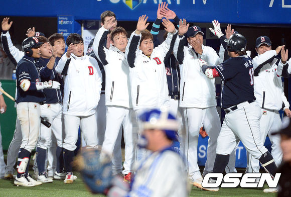 31일 오후 대구구장에서 열리는 '2013 한국야쿠르트 세븐 프로야구' 한국시리즈 6차전 삼성 라이온즈와 두산 베어스의 경기, 5회초 무사 두산 최준석이 선두타자로 나서 삼성 차우찬을 상대로 솔로 홈런을 때린 뒤 동료들에게 축하받고 있다.