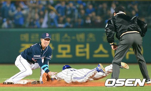 31일 오후 대구구장에서 열린 '2013 한국야쿠르트 세븐 프로야구' 한국시리즈 6차전 삼성 라이온즈와 두산 베어스의 경기, 5회말 삼성 공격 2사 1, 2루 상황 1루 주자 정병곤, 2루 주자 김태완이 이중 도루에 성공하고 있다. 사진은 1루주자 정병곤의 2루 도루 성공 장면.