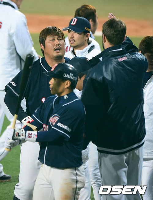 31일 오후 대구구장에서 열리는 '2013 한국야쿠르트 세븐 프로야구' 한국시리즈 6차전 삼성 라이온즈와 두산 베어스의 경기 5회초 두산 선두타자 최준석이 솔로홈런을 날리고 동료들의 축하를 받고 있다