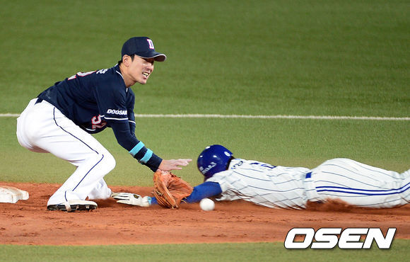 31일 오후 대구구장에서 열리는 '2013 한국야쿠르트 세븐 프로야구' 한국시리즈 6차전 삼성 라이온즈와 두산 베어스의 경기, 5회말 2사 1, 2루 1루 주자 정병곤, 2루 주자 김태완이 이중 도루에 성공하고 있다. 사진은 삼성 1루 주자 정병곤의 2루 도루 장면.