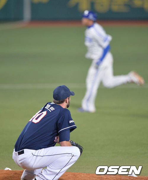 31일 오후 대구구장에서 열리는 '2013 한국야쿠르트 세븐 프로야구' 한국시리즈 6차전 삼성 라이온즈와 두산 베어스의 경기, 6회말 무사 1루 채태인에게 역전 투런 홈런을 허용한 니퍼트가 주저앉으며 아쉬워하고 있다.