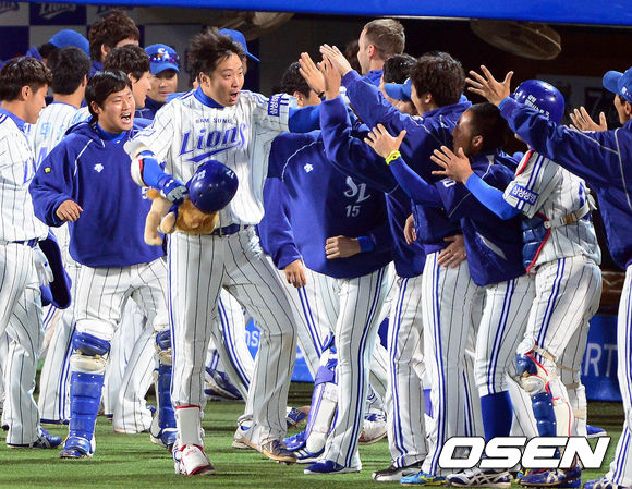 31일 오후 대구구장에서 열린 '2013 한국야쿠르트 세븐 프로야구' 한국시리즈 6차전 삼성 라이온즈와 두산 베어스의 경기 6회말 무사 1루 채태인이 투런포를 친 후 덕아웃에서 동료들과 하이파이브를 하고 있다.