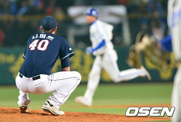 31일 오후 대구구장에서 열린 '2013 한국야쿠르트 세븐 프로야구' 한국시리즈 6차전 삼성 라이온즈와 두산 베어스의 경기, 6회말 삼성 공격 무사 1루 상황 채태인에게 역전 좌중간 투런포를 허용한 두산 선발 니퍼트가 그라운드에 주저앉아 아쉬워하고 있다.