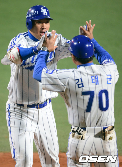 31일 오후 대구구장에서 열리는 '2013 한국야쿠르트 세븐 프로야구' 한국시리즈 6차전 삼성 라이온즈와 두산 베어스의 경기 6회말 무사 1루 삼성 채태인이 역전 2점 홈런을 날리고 김태균 코치와 하이파이브를 하고 있다