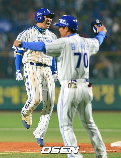 31일 오후 대구구장에서 열린 '2013 한국야쿠르트 세븐 프로야구' 한국시리즈 6차전 삼성 라이온즈와 두산 베어스의 경기, 7회말 삼성 공격 2사 1, 2루 상황 박한이가 우월 스리런포를 날리고 포효하고 있다.